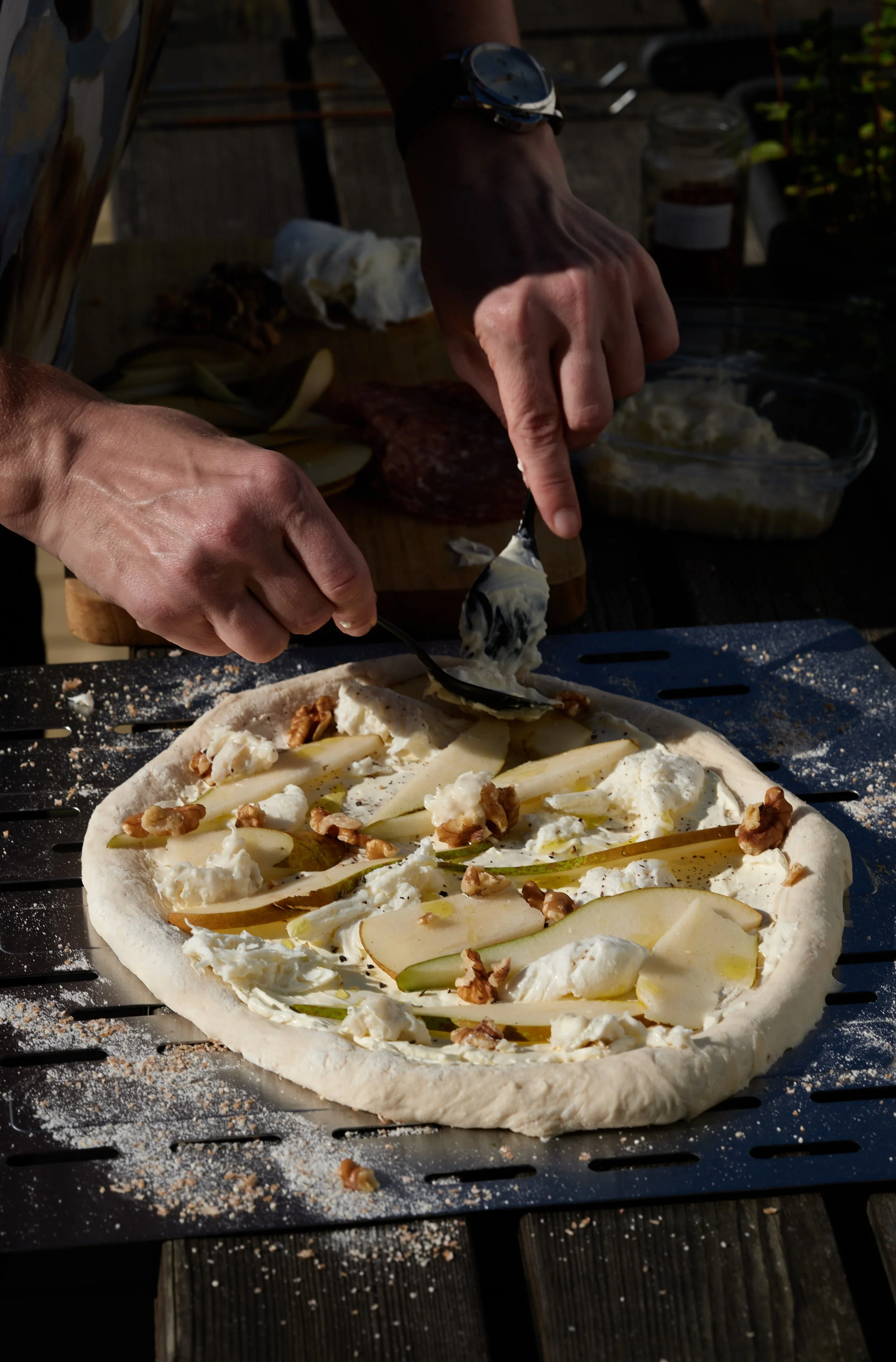 Spre creme fraiche, ha på en grei mengde olivenolje, salt, pepper, mozzarella, gorgonzola dolce, pære og salami på toppen.
