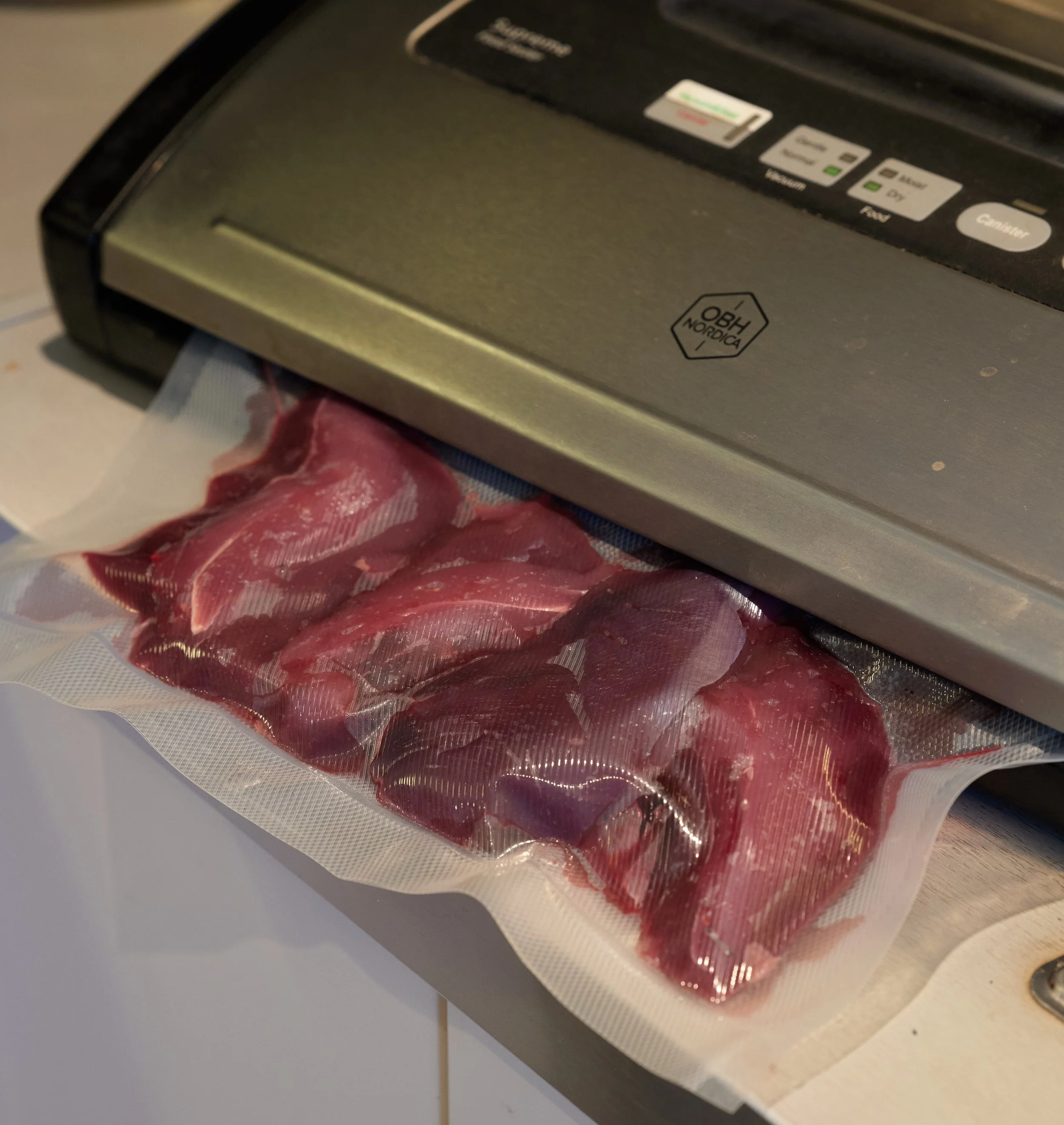 Skjær forsiktig ut bryststykkene på rypene. Ha disse i en vakumpose med en liten klatt smør og en gren timian (valgfritt). La de ligge i vannbad på 56 grader i en time. Ta ut posen og legg bryststykkene på en rist til avkjøling og tørking.
